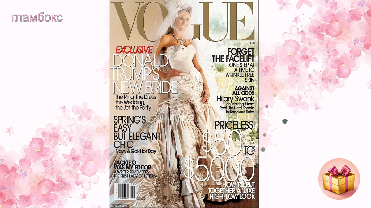 Ведь «Вог» радостно открыл для неё свои страницы, когда она была невестой, а не первой леди. В 2005 году, она появилась на обложке «библии моды» сразу после своей свадьбы с Дональдом Трампом. Счастливая новобрачная в роскошном свадебном платье от «Кристиан Диор От Кутюр» (фр. Christian Dior haute couture) стоимостью 100 000 долларов украсила обложку американского модного журнала.