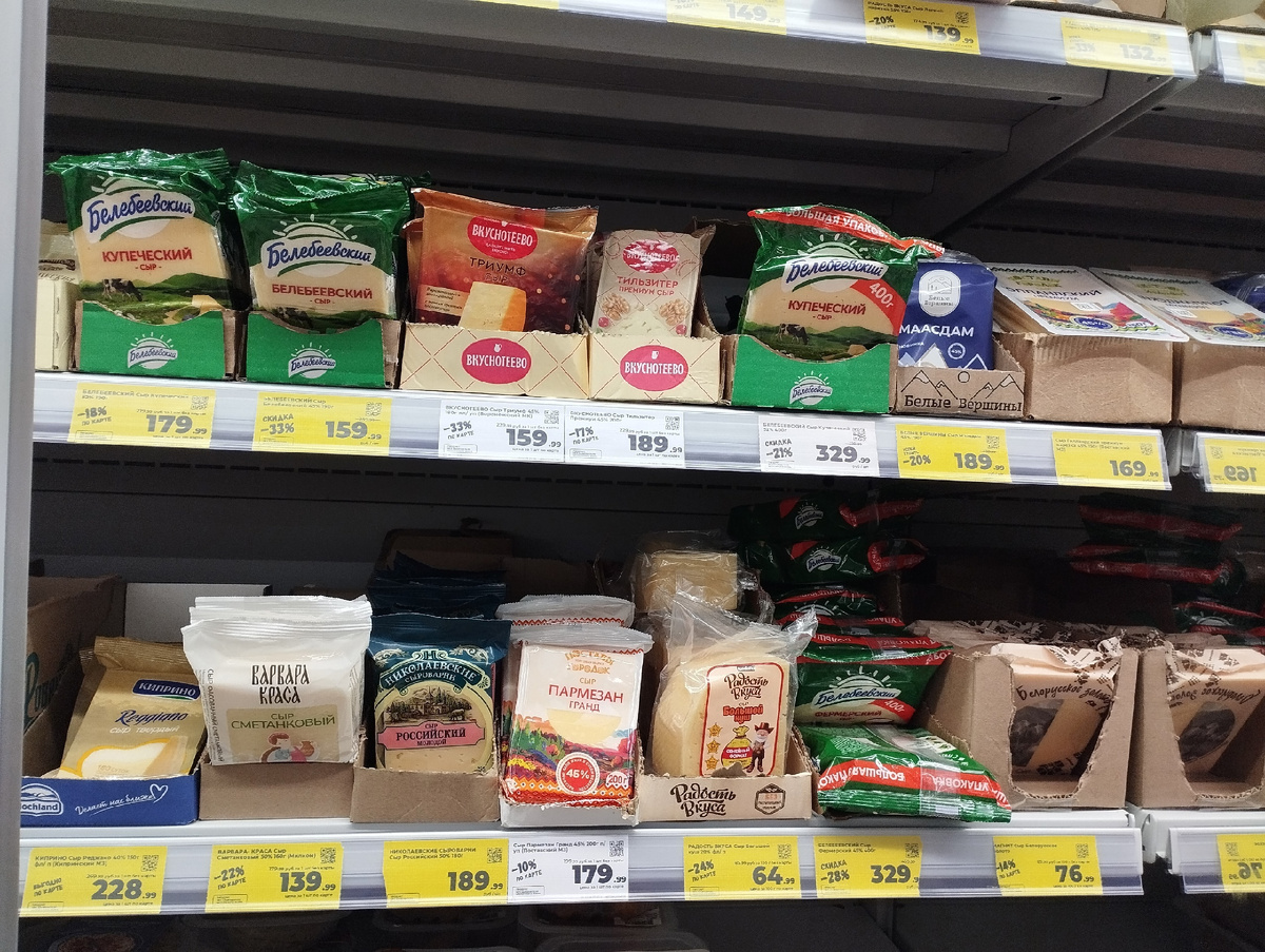 Итак, наступил понедельник, началась новая рабочая неделя, а, значит, самое время отправляться в супермаркеты и подыскивать новые акции! Шучу, конечно, но у меня начало недели выдалось весьма продуктивным, из-за чего я решила еще и подборки для вас составить, предварительно заглянув в разные продуктовые магазины. "Магнит" почему-то показался мне наиболее привлекательным, потому и предлагаю обсудить именно его. В нашем районе магазинов данной сети столько, что буквально за 15 минут пешей прогулки можно насчитать около 5-7 баннеров с этим названием, но я сегодня посетила один из небольших магазинов. И, знаете, даже при таком условии желтых ценников как будто бы много, на каждой полке попадались акционные товары. Но можно ли действительно сэкономить на их покупке? Давайте разбираться и рассуждать вместе: Выбор сыров впечатлил определенно. Мало того, что их много, так еще и большая часть - это сниженные цены. Давайте рассмотрим актуальную стоимость. В первой подборке отмечу следующие: твер