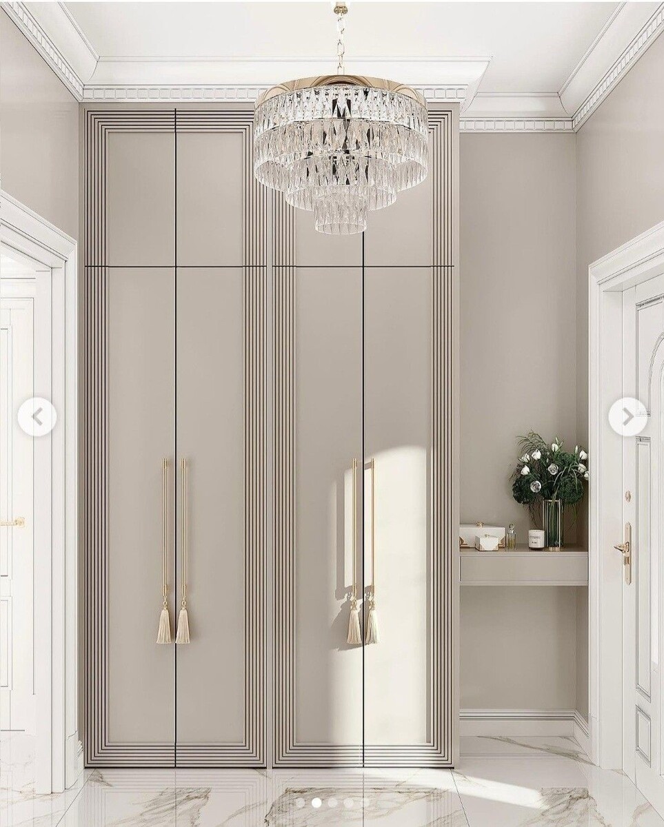 Очень сложно определиться, какой шкаф выбрать. С одной стороны, хочется нейтральный вариант без ручек, с гладкими фасадами. С другой стороны, красивые варианты с фрезеровкой, золотистой фурнитурой в интересных цветах смотрятся роскошно. Расскажем, как определиться с дизайном шкафа. Шкаф прежде всего должен совпадать по стилю с остальным пространством. Если ремонт уже сделан, это проще: можно выбрать вариант, который впишется в дизайн комнаты. Например, если на стенах обои с рисунком или декоративная штукатурка, на полу мраморный принт или инженерная доска, а в освещении вы планируете хрустальные элементы, то лучше выбирать более классические шкафы, например, распашной в оттенок стен с фрезеровкой фасадов и красивыми ручками. Если же стены окрашены в однотонный цвет, на полу минималистичный ламинат или кварцвинил, а на потолке — трековое освещение, подойдет сдержанный шкаф с гладкими фасадами в оттенке стен. Стилистика шкафа определяет его функциональность. На первый взгляд это не очеви