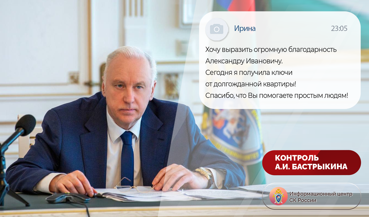 Ещё через несколько дней Ирине сообщили, что следователи возбудили уголовное дело. Оказывается, по закону, взамен сгоревшей, их семье была давно положена даже не комната в общежитии, а квартира. Словно по волшебству, вскоре Ирину попросили приехать посмотреть новое жильё. Квартира Ирине понравилась — сухая, чистая, уютная. До работы не далеко и в школу Антону идти близко. Прошло еще немного времени и семья, переехав и обустроившись, устроила скромное новоселье. Ирина испекла абрикосовый сдобный пирог, чтобы аромат домашнего угощения поселился в новой квартире. А вечером, когда все улеглись спать, снова зашла на страницу приёмной Председателя СК России «ВКонтакте» и написала: «Хочу выразить огромную благодарность Александру Ивановичу. Сегодня я получила ключи от долгожданной квартиры! Спасибо, что Вы помогаете простым людям!»