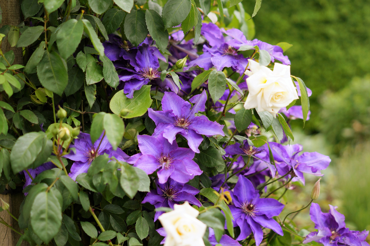 8. "Etoile Violette" - сорт высотой 400 см. Цветки раскрытые, пурпурно-фиолетовые с темной полосой, концы лепестков слегка отогнуты. Диаметр цветка до 15 см. Цветет обильно и продолжительно, с июня по сентябрь. 3-я группа обрезки.