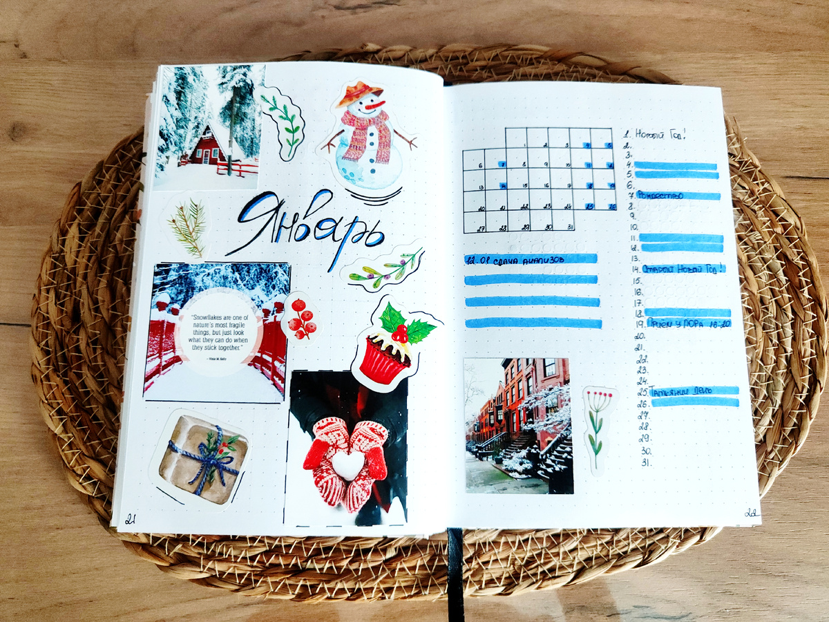 Этой статье больше подошло бы саркастическое название "сама пунктуальность" или "успеть в последний вагон". Вот не знаю в чем причина: развороты оформлены были уже в конце декабря, фото ежедневника сделано тоже достаточно давно и даже статья уже начала писаться, но случилось "что то" и все стало. Предполагаю, что это подобие творческого кризиса, когда кажется: да зачем и кому всё это нужно, нет идей для написания статей, раньше было лучше и все в подобном духе. Но постараюсь до конца месяца, не падать остатком этого самого духа, взять себя в руки (и ноги 😁) и не забросить, а в начале следующего месяца, наоборот побыть более активнее, чем раньше🤗 Ведь: Январь - идеальное время, чтобы перезагрузить компас своей жизни и проложить новый курс к своей мечте. – Рип Миллер Приступим: Первый разворот оформлен наклейками от любимой фирмы, люблю эти наклейки за невероятную бархатную поверхность и яркость изображения. Рядом разместился маленький календарь с описанием важных дат. Трекер