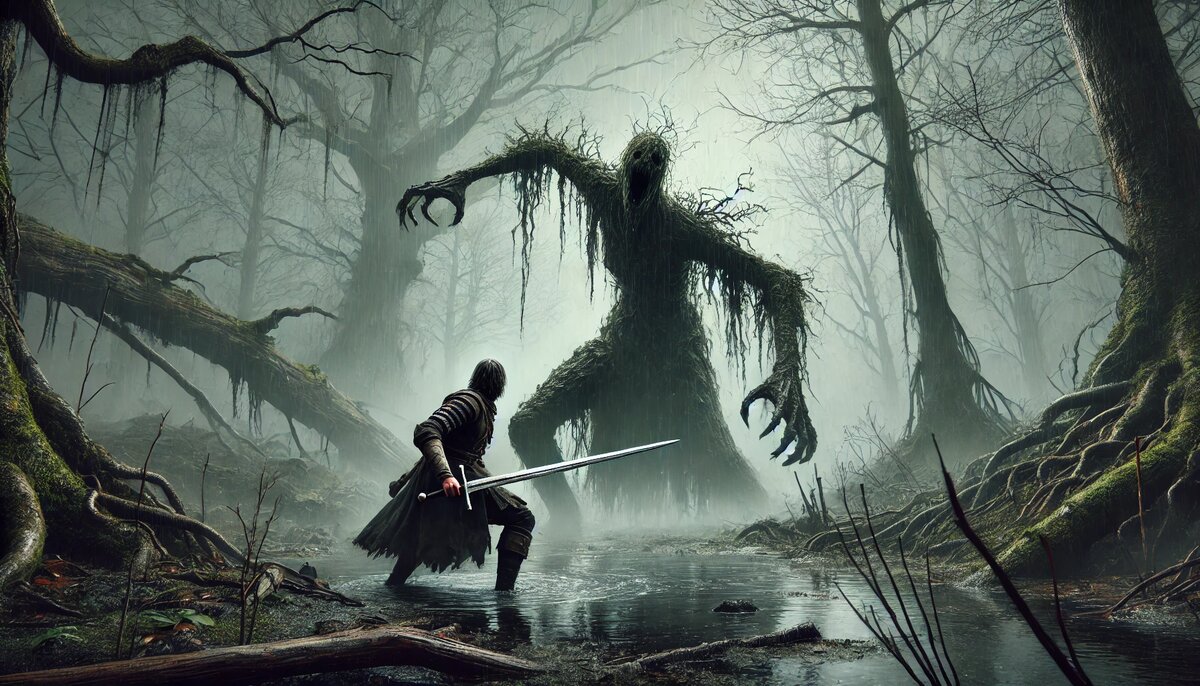 Мгларь, также известный как Хозяин Топей, — древний ужас, сокрытый в сердце трясин и туманов Великих Топей. Это существо, окутанное легендами и страхом, с давних времён наводит ужас на тех, кто осмеливается пересечь границы болот. Его появление — знак неминуемой гибели, а само его имя шепчут лишь в полумраке, опасаясь, что оно привлечёт его внимание. Внешность Мгларя вызывает первобытный ужас. Его гигантская фигура, сливающаяся с болотным пейзажем, напоминает ходячее древо, покрытое чёрным мхом и гниющей листвой. Ветви, сплетающиеся в нечто напоминающее конечности, изгибаются и движутся с нечеловеческой гибкостью. Лицо, если можно так назвать этот тёмный провал среди лиан и корней, лишено каких-либо черт, кроме зловещей пустоты, источающей всепоглощающий мрак. Говорят, что Мгларь не просто порождение природы — он её воплощение. Болота дышат сквозь него, туман стекает по его телу, а вода принимает его шаги, как если бы сама земля принадлежала ему. Он не оставляет следов, не издаёт звук