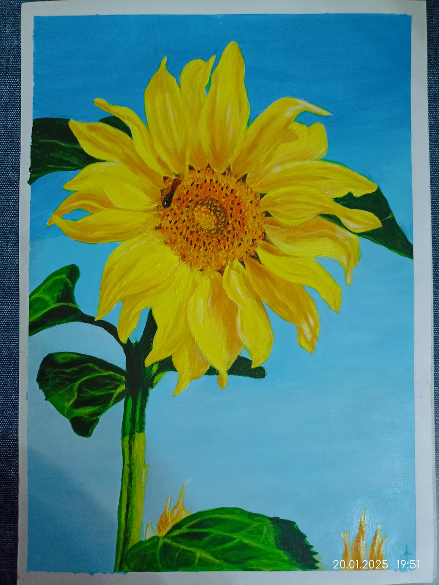Приветики. И наконец мой любимый подсолнух. Посмотрите как он смотрит, ну как будто удивлен этим миром. Какой он красивый, не правда ли? И букашка села на подсолнух. Что она там делает , отдыхает? Или нектар пьет. Мы не узнаем. А вам нравятся подсолнухи? Или не обращали внимания? Или вы всегда жили в городе и не видели как они растут? Ну так съездите, посмотрите, поверьте подсолнухи незабываемые , ну просто ах, в разгар цветения особенно. Исполнена на бумаге, акриловыми красками.