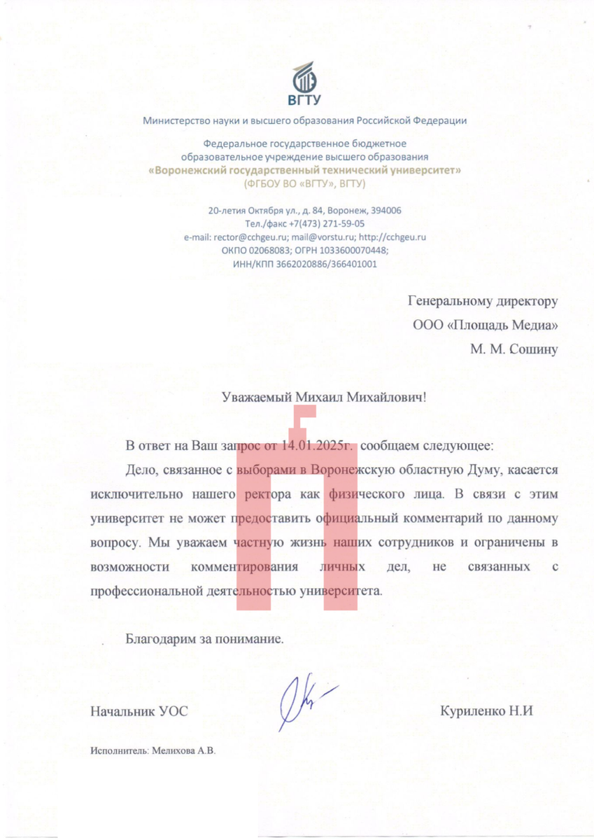 В ответе на запрос намерения господина Проскурина прямо не подтверждают, однако и опровержения не дают. Более того, выборы в облдуму назвали «делом нашего ректора»: «Дело, связанное с выборами в Воронежскую областную Думу, касается исключительно нашего ректора как физического лица. В связи с этим университет не может предоставить официальный комментарий по данному вопросу. Мы уважаем частную жизнь наших сотрудников и ограничены в возможности комментирования личных дел, не связанных с профессиональной деятельностью университета». По данным редакции, Дмитрий Проскурин планирует занять место ректора ВГУ Дмитрий Ендовицкого. Кроме того, от выборов может отказаться Игорь Есауленко из