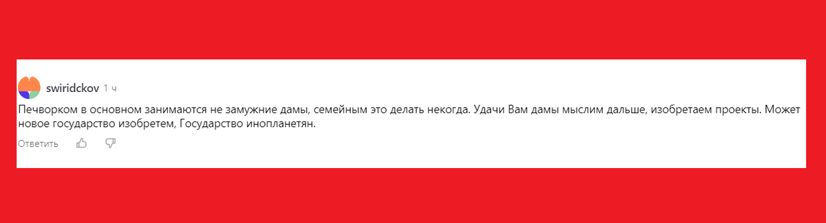 Добрый день, дорогие друзья и любители лоскутного шитья. Пока мы с вами увлеченно шьем и изучаем премудрости пэчворка, на мой канал прилетают всякого рода комментарии от людей, которые оказались в моей Мастерской совершенно случайно. Так можно было бы о них подумать, если бы не одно обстоятельство. Дело в том, что в настройках по умолчанию Дзен прописал правило о том, что комментарии могут оставлять только подписчики канала. Выходит, все же неслучайно оказались здесь авторы комментариев, о которых я вам сегодня расскажу. Первый необидный, а скорее смешной. Посудите сами: "Пэчворком в основном занимаются незамужние дамы, семейным это делать некогда. Удачи вам дамы мыслим дальше, изобретаем проекты. Может новое государство изобретем, Государство инопланетян.(пунктуация автора сохранена) Признаться честно, я смеялась от души. Во-первых, я сама занимаюсь пэчворком много лет, но я - семейная дама, и всю жизнь шью для своих близких. Кроме того, часто получаю сообщения от зрителей, в которых