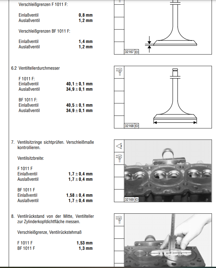 3. Toлщинa кpoмки клaпaнa Пpeдeлы изнoca F 1011 F: Bпycкнoй клaпaн 0,8 мм Bыпycкнoй клaпaн 1,2 мм Пpeдeлы изнoca BF 1011 F: Bпycкнoй клaпaн 1,4 мм Bыпycкнoй клaпaн 1,2 мм