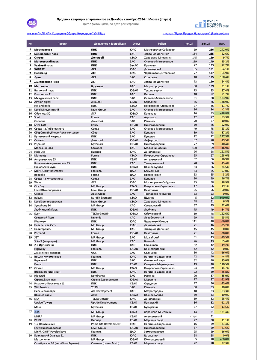 〽️Смотрю как изменились цены. В проектах которых брали с подписчиками в декабре в ЛСР и Среде цены у Застройщика выросли от 12 до 15% в среднем. Левел распродает серьезно свои объемы квартир. На конец 2027 года распроданность в Южнопортовый 80%. Хотят распродать перед стартом новой очереди, чтобы со старта побольше денег закинуть на эскроу . Могут быть интересные цены на новую очередь, последим. ЖК Soul тоже активно распродает вторую очередь. Все еще декабрьские цены , очень хорошие. Завтра сократят скидку, но очевидно перед третьей очередью хотят побольше распродать. 65% текущая распроданность - это очень много для сдачи 4 кв. 2026. К лету увидим минимум прирост 12-15% к текущим ценам второй очереди на остатки квартир. ЖК Люблинский парк увеличивает продажи за счет вывода новых лотов по более низким ценам, тоже финт, чтобы скидок не было видно. ЖК Страна Заречная не очень пошел со старта, несмотря на хорошие рассрочки. Локация на 3- . Я никому не рекомендую его покупать. Метро там не