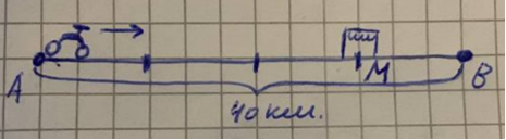 Перед тем, как прочитать данную статью про решение задач на часть числа, предлагаю ознакомиться с понятием дробь и часть числа в другой статье. Решим несколько задач на часть числа. Задание 1. Велосипедист проехал по шоссе 40 км. Через три четвертых (3/4) пути он заехал в магазин. На каком расстоянии велосипедист заехал в магазин? Решение. Сделаем рисунок. Пусть велосипедист ехал из пункта A в пункт B. Расстояние от A до B по условию задачи равно 40 км. Поскольку через три четвертых пути он заехал в магазин, разделим отрезок AB на 4 части. Вспомним, что знаменатель означает общее количество частей, значит, четыре части на отрезке будут составлять 40 км. Нам нужно узнать, сколько километров составляет три части из четырех. Чтобы найти это, вычислим, сколько километров составляет одна часть из четырех. Для этого надо 40 км разделить на 4. Получим, что 1 часть = 10 км. Следовательно, три части из четырех будут равны 3 · 10 = 30 км. Таким образом, велосипедист заехал в магазин на расстояни