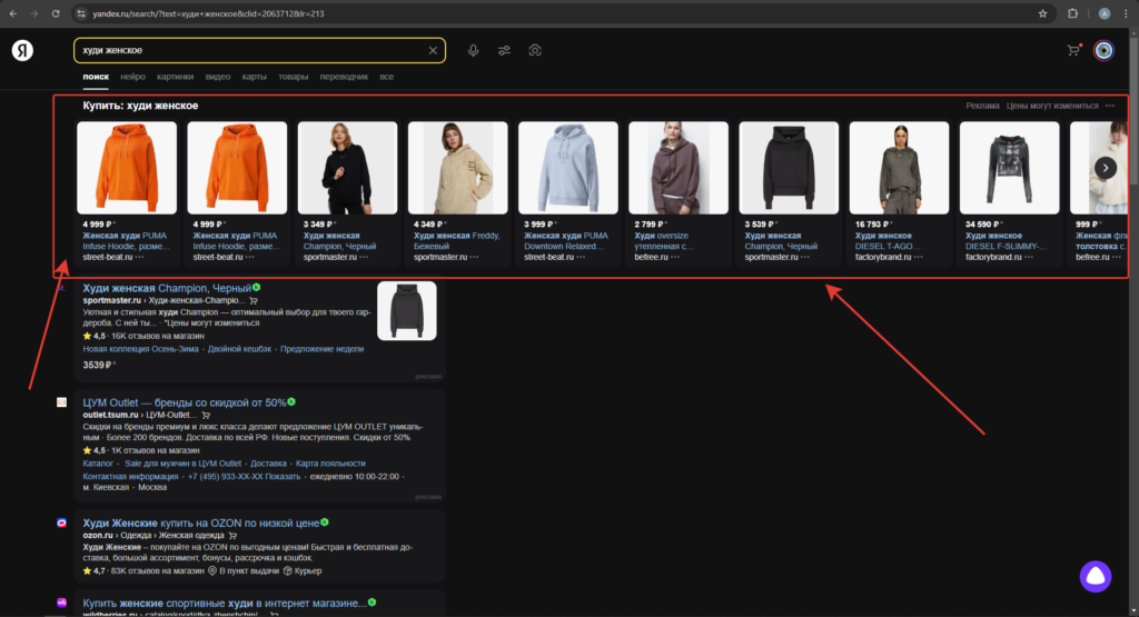 Реклама карточек товара Wildberries, Ozon в Товарной галереи Яндекс