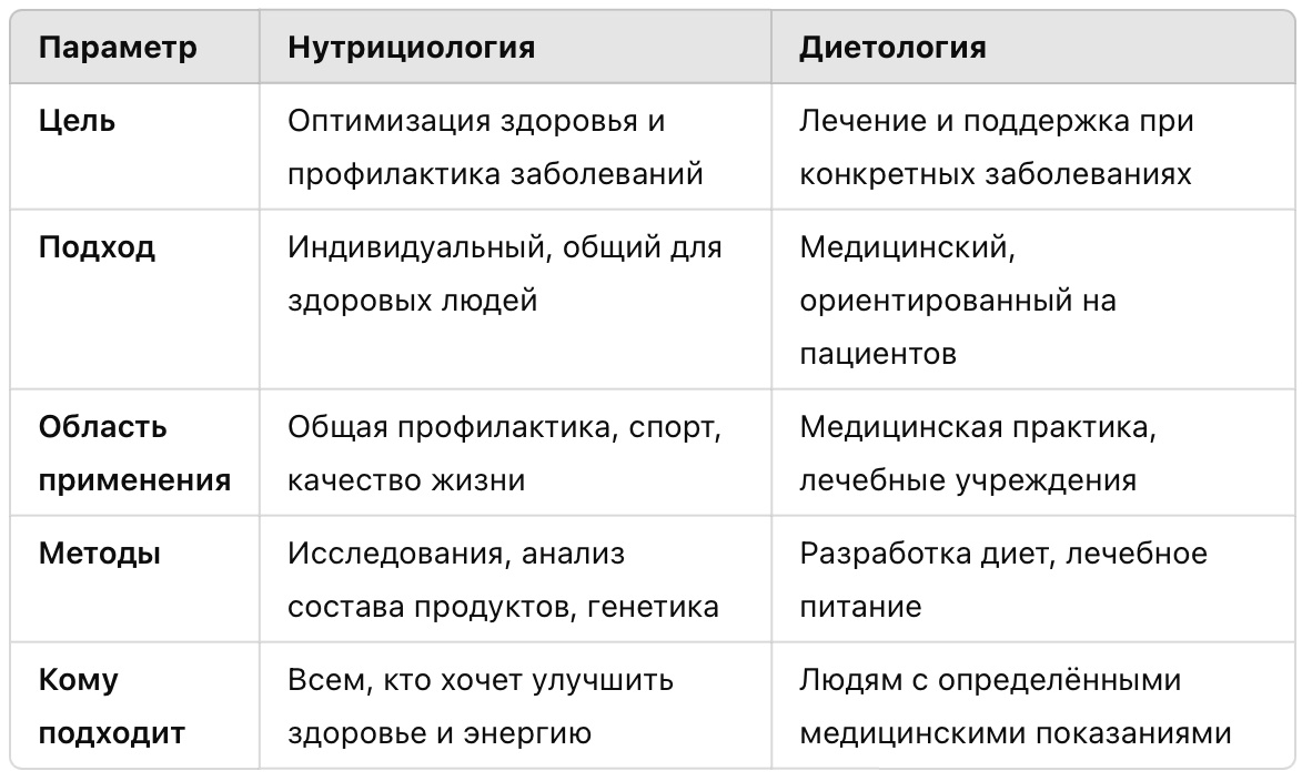 В современном мире правильное питание и здоровый образ жизни становятся всё более популярными темами. В этом контексте часто упоминаются такие дисциплины, как нутрициология и диетология. Несмотря на то, что эти понятия тесно связаны, они имеют свои особенности и задачи. Давайте разберёмся, что они означают и в чём их различия. Нутрициология — это наука о питательных веществах, их роли в организме и влиянии на здоровье человека. Она изучает, как продукты питания, их состав и взаимодействие с физиологией человека влияют на: Нутрициология охватывает широкий спектр вопросов — от биохимических процессов до социальной роли питания. Это делает её особенно актуальной в условиях растущего интереса к здоровому образу жизни. Диетология — это прикладная дисциплина, которая фокусируется на составлении рационов питания для профилактики и лечения различных заболеваний. Основное внимание уделяется подбору диет для: Хотя обе дисциплины изучают питание, их задачи и подходы различаются. Знание разницы м