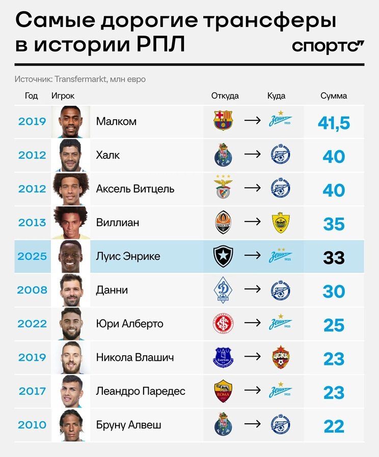 Дороже Энрике для российских клубов были только Малком (41,5 млн евро), Халк (40 млн), Аксель Витцель (40 млн) и Виллиан (35).