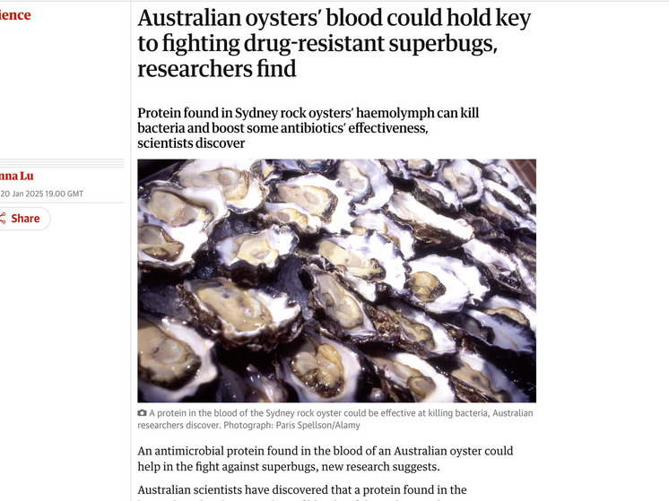 Новое исследование показывает, что антимикробный белок, обнаруженный в крови австралийской устрицы, может помочь в борьбе с супербактериями. Австралийские ученые обнаружили, что белок, содержащийся в гемолимфе (эквиваленте крови) сиднейской скальной устрицы Saccostrea glomerata, может убивать бактерии и повышать эффективность некоторых обычных антибиотиков. Устойчивость к противомикробным препаратам описывается как « надвигающийся глобальный кризис здравоохранения », который — без принятия срочных мер — может сделать критически важные препараты неэффективными и привести к сокращению продолжительности и качества жизни к 2050 году. В лабораторных тестах белок гемолимфы сам по себе был эффективен в уничтожении бактерий Streptococcus pneumoniae , которые в основном вызывают пневмонию, и Streptococcus pyogenes , виновника ангины и скарлатины. Он еще не был испытан на животных или людях. При использовании в сочетании с антибиотиками, включая ампициллин и гентамицин, он повысил их эффективнос
