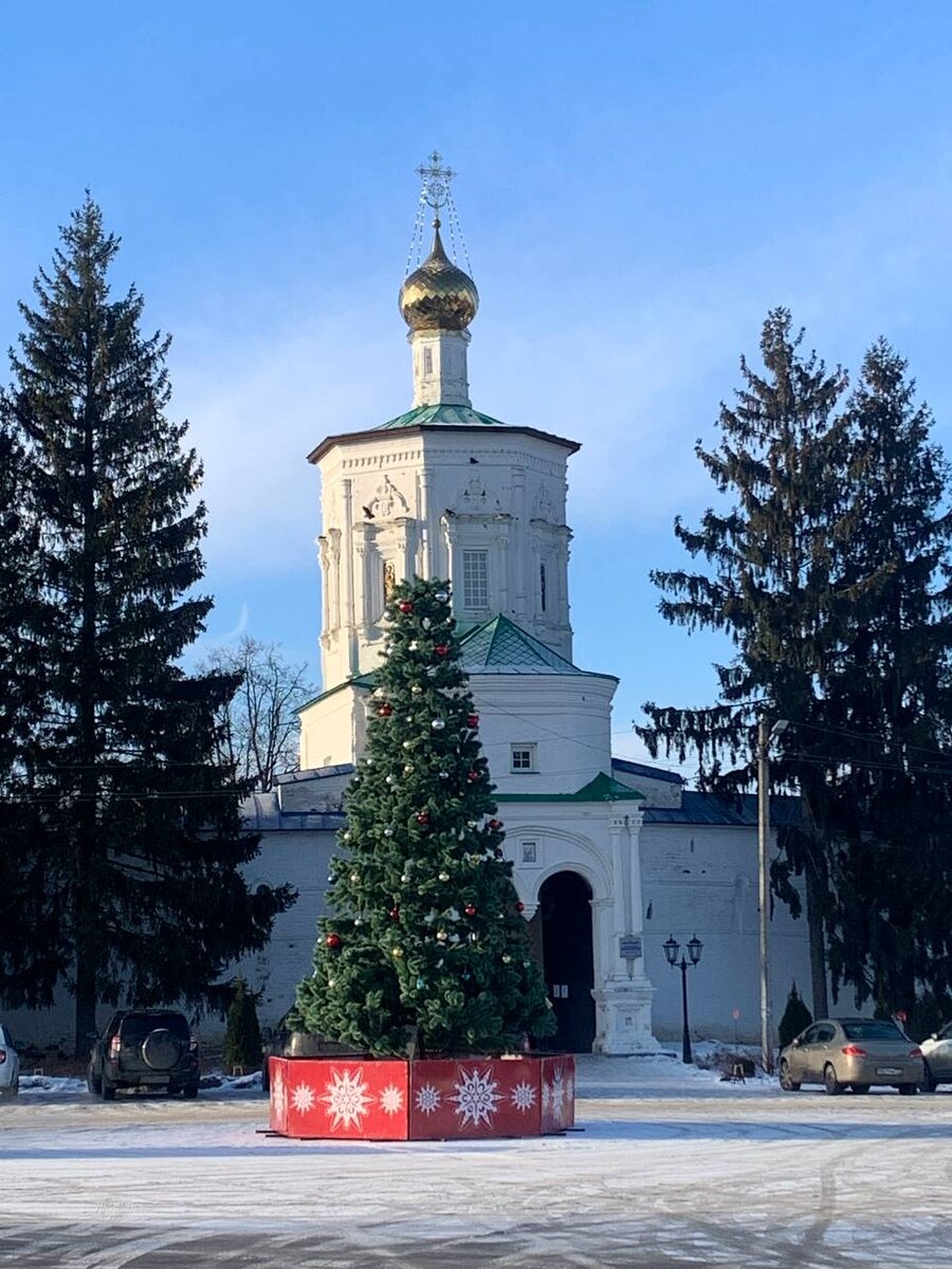 У тех, кто любит путешествовать на своём автомобиле, всегда есть места, приехав куда однажды, нельзя их позабыть и постоянно хочется возвращаться, хотя бы на денёк. Для нашей семьи одно из таких мест - Солотча, курортный посёлок около Рязани. Рязанцы, простите! Называть Солотчу частью Рязани не поворачивается язык! Курорт ведь, по определению, местность с целебными природными свойствами, которую используют не только для лечения, но и для отдыха. Впервые я приехала с дочками в Солотчу летом 1996 года. Историю знакомства с Солотчей, наполненную приключениями, постараюсь рассказать в следующий раз. С тех пор каждый год мы приезжаем в это чудесное место. Не стал исключением и наступивший 2025 год. Мы приехали в новогодние праздники. Это центральная площадь посёлка перед Солотчинским Рождества Богородицы женским монастырём. С монастыря началась история Солотчи. Ёлка загораживает центральный вход в монастырь, но надвратная церковь Иоанна Предтечи видна прекрасно. На территории монастыря