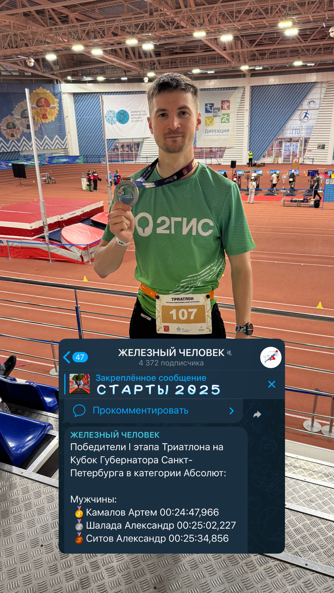 1 место в абсолюте среди мужчин, на соревновнованиях по триатлону в помещении.