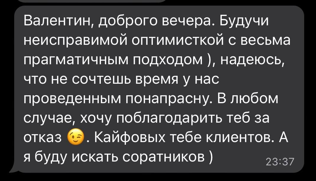 ПОЛУЧИЛ ТАКОЕ СООБЩЕНИЕ и решил поделиться этой историей… Получил благодарность за то что отказался проводить обучение в крупной компании🙌 (Не согласовывал, поэтому без имени и без названия компании - думаю так будет честно) Я познакомился с прекрасным человеком и прекрасным предпринимателем с достаточно большим бизнесом, где работает 3 отдела продаж, есть 3 руководителя отдела продаж … Она сама действительно классная🫶 Мы всё обсудили, договорились на достаточно высокий чек за обучение и всё в целом хорошо и прекрасно🤝 Однако, от руководителей отделов продаж стали поступать интересные вопросы, которые в первую очередь у меня вызвали мои вопросы😮 Было принято решение - перед стартом обучения встретиться и пообщаться всем вместе … Это в было в г. Москва (я приехал к ним в офис) После 40 минут совместного общения, я озвучил руководителю "прости, я не буду работать с вами" А поздно вечером она мне прислала это сообщение … ТАК ЧТО ЖЕ ПРОИЗОШЛО? В первую очередь был мой косяк😨 Сам всегд