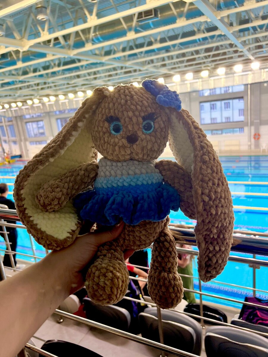 Скажу честно - я всю жизнь любила вязать детские вещи. Но это и объяснимо - трудовых затрат меньше, радостных эмоций больше. Был период, когда я вязала исключительно пинетки. Наверное, не одну сороконожку можно было обуть))) И костюмчики вязала, и платья, и комбинезоны. И сейчас мне очень приятно, когда заказчики присылают фото своих деток с моими игрушками. И очень часто встречается приписка - "Не могу нормально сделать фото, дочка из рук не выпускает". По понятным причинам я не могу опубликовать такие фото, но обязательно сохраняю. Но про одного зайца я, как и обещала, расскажу. Эту игрушку получила в подарок очень милая девочка из Калуги - Вика Лузган. Вике всего 14 лет, но она уже кандидат в мастера спорта по плаванию, многократная победительница и призер соревнований различного уровня. Плаванием она занимается уже много лет, в прошлом году участвовала во всероссийских соревнованиях. Для первого раза показала очень приличные результаты. Для меня это абсолютно недосягаемый уровен