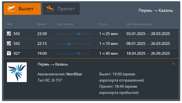 В расписании аэропорта Большое Савино добавился новый рейс в Казань. Перелёты по пятницам будет осуществлять авиакомпания NordStar на самолётах Boeing 737. Отправление в 19:00. Информация появилась на онлайн-табло а/п «Пермь». Первый вылет назначен на 18 апреля 2025 года, а завершающий рейс запланирован на 26 сентября 2025 года. NordStar — российская авиакомпания, входящая в число 15 крупнейших авиакомпаний России по данным Росавиации. Её пассажирооборот превышает более 1 млн человек в год. Выполняет внутренние и международные пассажирские авиаперевозки. Базовыми аэропортами являются «Домодедово» (Москва) и «Красноярск» (Красноярск). На данный момент рейсы из Перми в Казань уже выполняет авиакомпания «ЮВТ Аэро». Эти полёты являются субсидированными, лётная программа рассчитана пока до 26 марта 2025 года. Ранее сообщалось, что из расписания пермского аэропорта с января исчез прямой рейс до Красноярск. Ранее перелёты два раза в неделю выполняла авиакомпания «Россия» (входит в ГК «Аэрофло