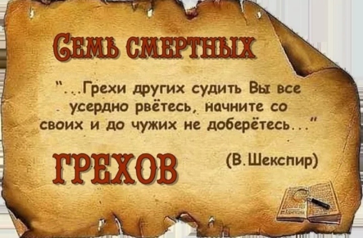 Семь смертных грехов являют собой: Язычество, Иудаизм, Христианство, Мусульманство, Буддизм, Индуизм и все прочие религиозные верования, в которые веруют живущие на планете Земля живые земные народы. Не было бы этих религиозных верований, не было бы и смертных грехов. И это не только религиозные войны за гроб господень, которого никто никогда не видал. Которого никогда не было, как и господа похороненного в нём. Но жертв смертных, за этот выдуманный миф, было положено немало. И по сей день не прекращаются эти жертвоприношения, которые не только прощаются существующими религиозными церквами, но и благословляют идущих на смертное дело плотных людей. И, благословляя людей, богохульствуют, ибо делают это от Имени Всевышнего Творца, создавшего сей плотный жизненный мир на Земле. Или думаете, что если вы сами своими руками не убиваете, значит, и грехов на вас нет. Паразиты вы Сущие и есть паразиты. Вам мало скорбей, которые вы пожинаете на Украине, Израиле, Иране и в других местах, и страна