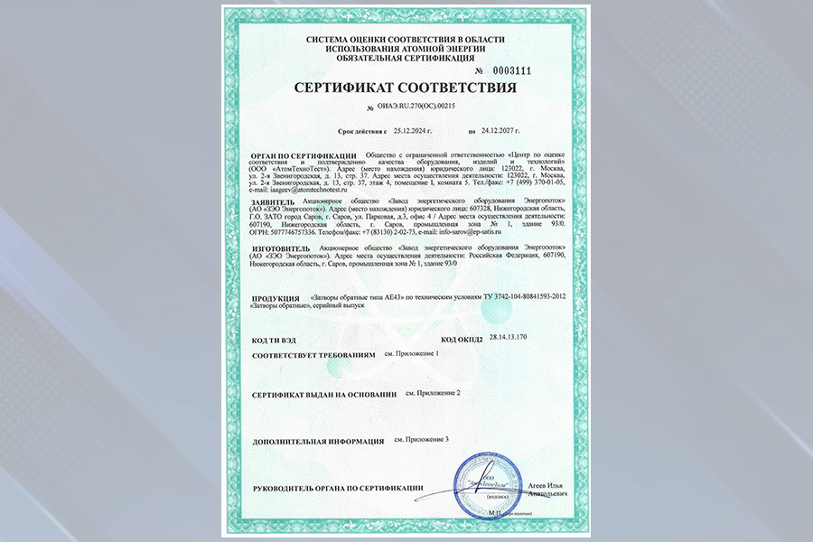 АО «ЗЭО Энергопоток» получило Сертификат соответствия № ОИАЭ.RU.2704(ОС).00215 на затворы обратные типа АЕ43 по техническим условиям ТУ 3742-104-80841593-2012 «Затворы обратные типа АЕ43, серийный выпуск».