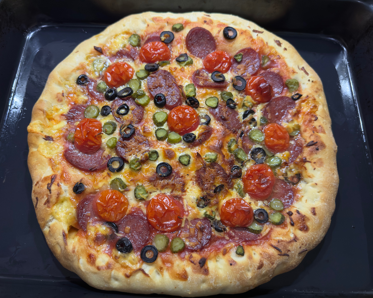 Всем доброго времени суток 🔥 Сегодня приготовим вкусную, сытную, сочную домашнюю пиццу 🍕 Самое сложное в процессе её приготовления – это тесто, но если у вас есть хлебопечка, вам это не составит ни малейшего труда🔥 Рецепт теста для пиццы смотрите в нашей статье по ссылке 🔗 Итак, тесто мы уже приготовили, нам остаётся начинка. На самом деле начинку вы можете выбрать абсолютно любую, какую душе угодно. Мы же предлагаем проверенный нами рецепт👌🏻 Ингредиенты для пиццы диаметром 30 см: ⁃ кетчуп - 2-3 ст. л.; ⁃ колбаса салями - 300 г; ⁃ маслины без косточек - грамм 100-150; ⁃ корнишоны маринованные - 5 шт.; ⁃ сыр твёрдый любой - 150-200 гр (тут смотрите по своему вкусу, так как в пицце сыра много не бывает); ⁃ помидорки черри - 200 гр Итак, включаем духовку на 180 градусов и смазываем противень оливковым или растительным маслом. Пока духовка греется, тесто для пиццы, раскатываем в круг диаметром 30 см. Важно ☝🏼 муку при раскатке не добавляем!!! Тесто и так отлично