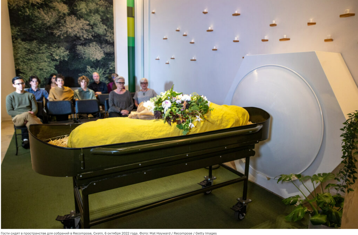 Климатические изменения побуждают людей думать не только о том, как экологичнее жить, но и как умереть без вреда для окружающей среды. Гробы и забальзамированные тела загрязняют почву, а для кремации необходимо много топлива, из-за чего в атмосферу выбрасывается большое количество углекислого газа. Поэтому в США предложили переработать человеческие останки в натуральное удобрение — компост.