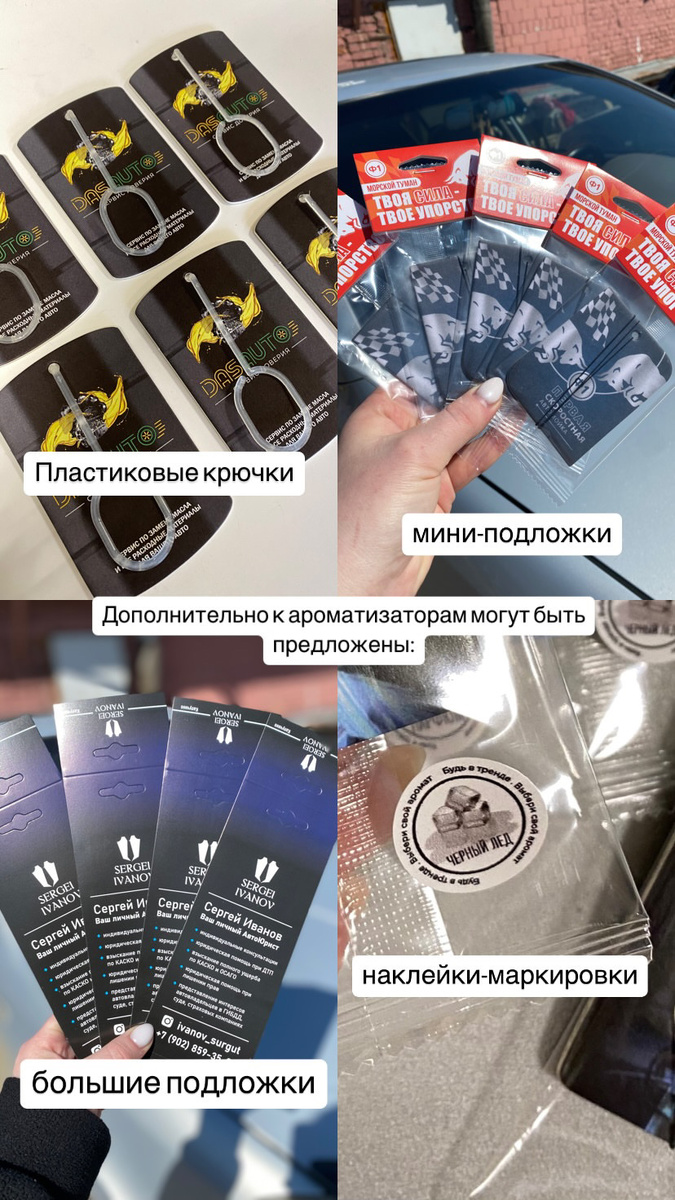 На нашем производстве, помимо картонных и капсульных ароматизаторов, вы можете заказать и различные дополнения, которые помогут выделить ваш продукт на рынке. 1. Мини подложка — идеальное решение для продаж! Благодаря прочным держателям она легко крепится на стеллажах, привлекая внимание покупателей. 2. Большая подложка — отличный вариант как для продажи, так и в качестве подарка клиенту. Она позволяет разместить больше информации о вашем продукте, что способствует повышению узнаваемости бренда. 3. Наклейка маркировка — уникальный способ выделить ваш ароматизатор среди конкурентов. Обозначая ароматы с помощью стильной наклейки, вы добавляете индивидуальности вашему продукту. 4. Пластиковые крючки — многоразовый держатель для ароматизатора. Вы можете выбрать между резинкой и крючками, чтобы подобрать идеальный вариант для вашего товара. Или же заказать оба варианта. Если у вас есть вопросы или вы хотите сделать заказ, пишите нам!