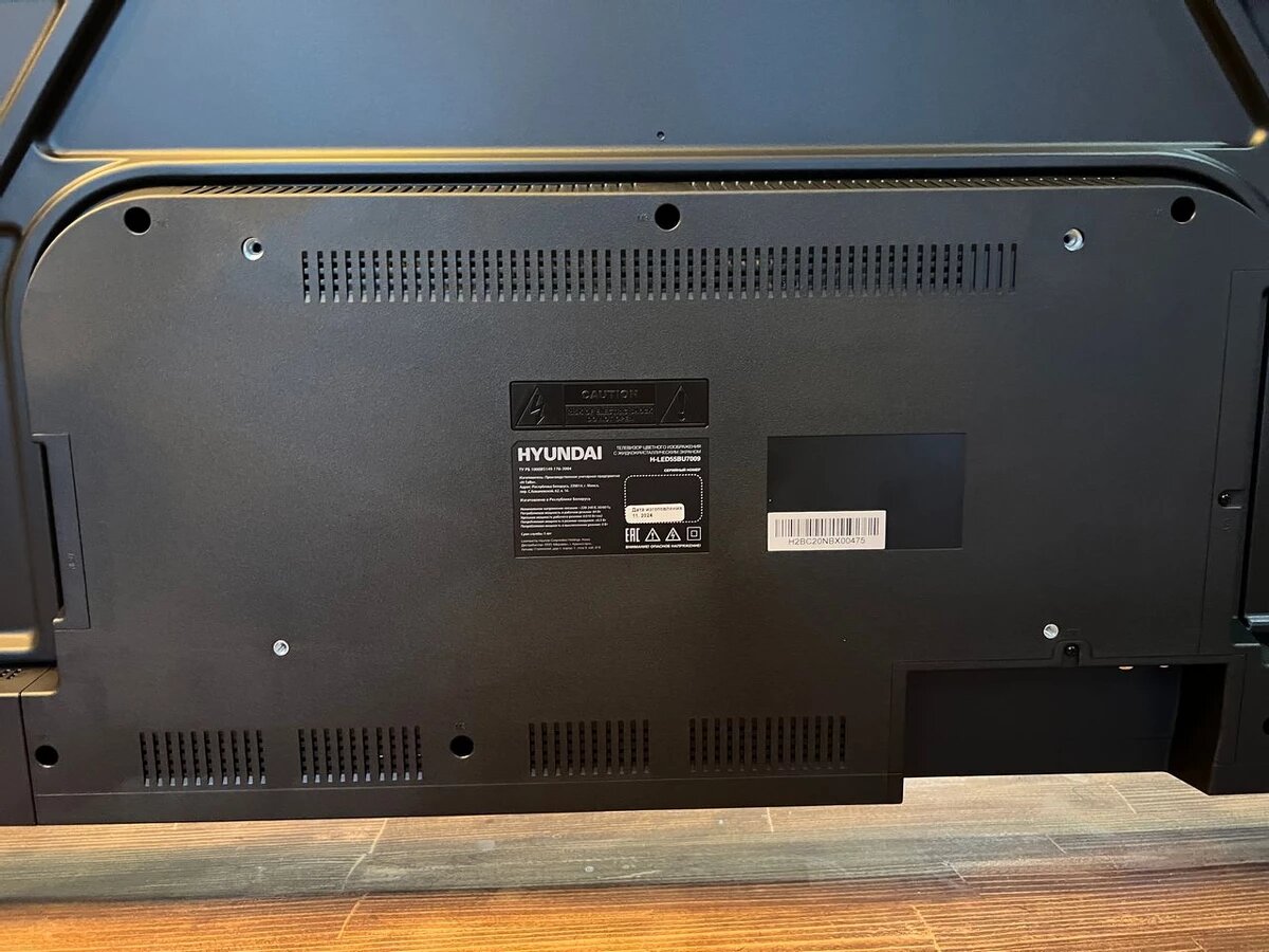 Рамка с трех сторон экрана тонкая, а снизу наблюдается чуточку более широкий “подбородок” с логотипом бренда HYUNDAI. Собственно, именно спереди вы и будете смотреть на телевизор 99% времени, а потому изыски дизайна сзади или сбоку не имеют особого значения, но отмечу, что и там телевизор выглядит нормально.