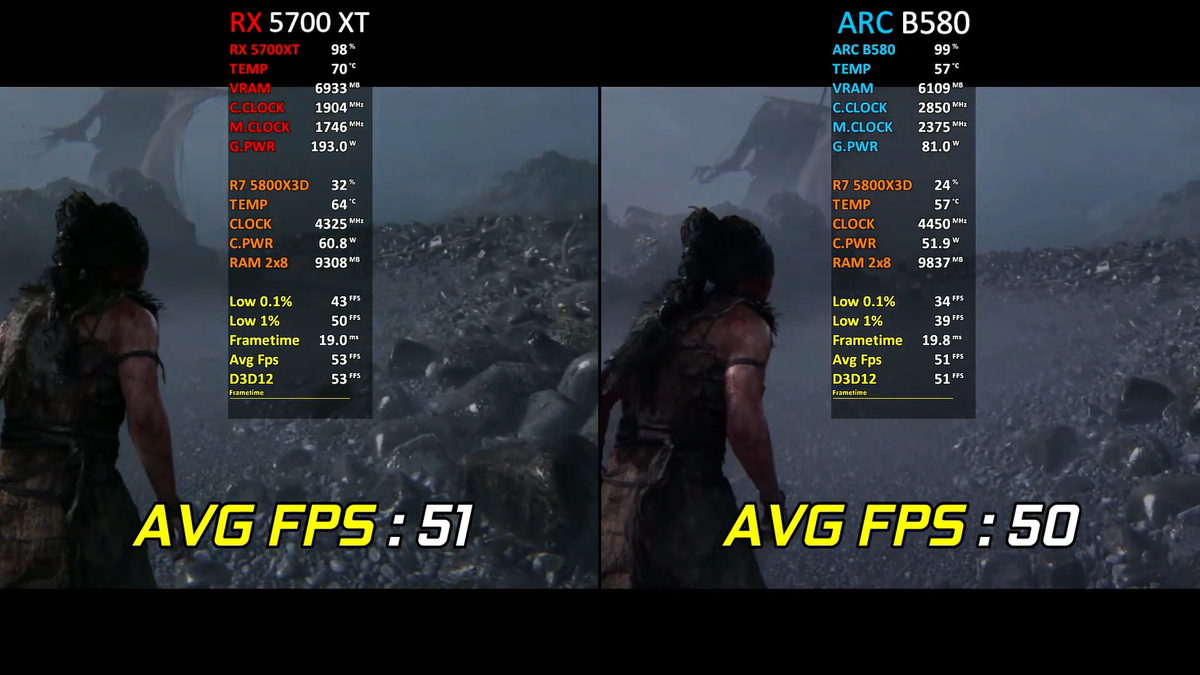 На YouTube-канале Games Choices узнали, какой средней производительности стоит ожидать от сборок с RX 5700 XT и Intel ARC B580 в Full HD. Hellblade 2 запускалась с пресетом Medium. Средняя производительность в ней составляла 51 к/с (RX 5700 XT) и 50 к/с (ARC B580). The Last of Us тестировалась на ультра-настройках графики. В среднем в этой игре удалось получить 59 к/с (5700 ХТ) и 62 к/с (В580). Cyberpunk 2077 шла с пресетом Custom. Средняя частота кадров здесь равнялась 64 к/с (AMD) и 87 к/с (Intel). Игра CS:GO 2 запускалась с графикой Custom. Средняя производительность в ней находилась в районе 267 к/с (5700 ХТ) и 293 к/с (В580). Forza Horizon 5 тестировалась с ультра-пресетом. В среднем здесь удалось получить 106 к/с (AMD) и 91 к/с (Intel). Со всеми результатами тестирования вы можете ознакомиться ниже в видео. В среднем разница между RX 5700 XT и Arc B580 во всех играх составила около 4% (88 к/с и 92 к/с соответственно). Характеристики сборок: - корпус Lian Li Lancool II Mesh argb;