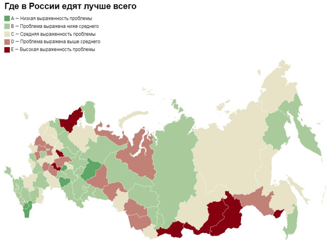 При оценке качества рациона эксперты опирались на «Индекс здорового питания населения России», разработанный в лаборатории демографии и эпидемиологии питания ФГБУН «ФИЦ питания и биотехнологии». Хуже всего, как выяснилось, питаются жители Мордовии, Карелии и Ивановской области. В их рационе много соли, жира и сахара. Наиболее сбалансированное питание у жителей Дагестана, Чувашии и Чечни. Как утверждается, там потребляют меньше насыщенных и животных жиров по сравнению с другими регионами, но в целом рацион сбалансированный, разнообразный, а мясо потребляется в умеренных количествах. Также в лидерах жители Севастополя, Самарской области, Санкт-Петербурга и Пермского края. Москва расположилась на восьмой строчке рейтинга. В столице потребляют фрукты и мясо выше нормы, при этом высок процент жира в дневном рационе — целых 40%, сообщает радио bfm. Астраханская область расположилась на 56 месте.