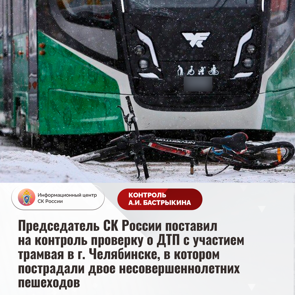 Председатель СК России поставил на контроль проверку о ДТП с участием трамвая в г. Челябинске, в котором пострадали двое несовершеннолетних пешеходов 20 января текущего года в городе Челябинске водитель трамвая совершила наезд на двух несовершеннолетних пешеходов, пересекающих проезжую часть на разрешающий сигнал светофора. Пострадавшим потребовалась медицинская помощь. Указанное происшествие получило распространение в СМИ. В СУ СК России по Челябинской области по данному факту организована процессуальная проверка. Председатель Следственного комитета Российской Федерации Александр Иванович Бастрыкин поставил ход процессуальной проверки на контроль в центральном аппарате ведомства и поручил руководителю СУ СК России по Челябинской области Алексею Ивановичу Колбасину представить доклад о ее предварительных и окончательных результатах. #СледственныйКомитет #СКРоссии #СКР #ИЦСКР #ИнформационныйЦентр #АлександрБастрыкин #ПредседательСКР #КонтрольПредседателяСКР #КомментарийКонтроль #Челябин