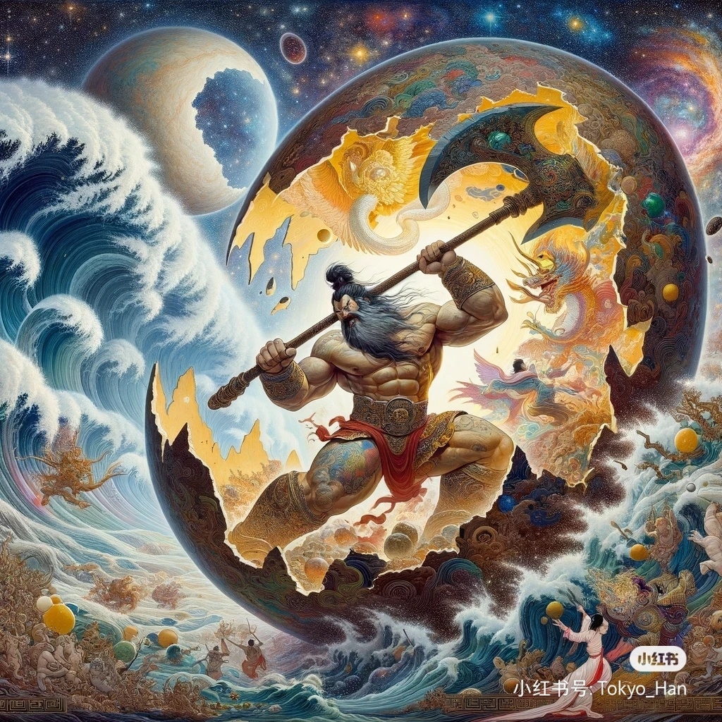 Паньгу, гигантское существо, родилось в этом яйце. Когда он расколол его, части яйца превратились в небо и землю, а сам Паньгу стал стержнем, поддерживающим их. С каждым днем Паньгу становился все больше, и мир продолжал развиваться. Этот миф символизирует важность борьбы между хаосом и порядком, а также ценность труда и самопожертвования ради гармонии и порядка в мире.