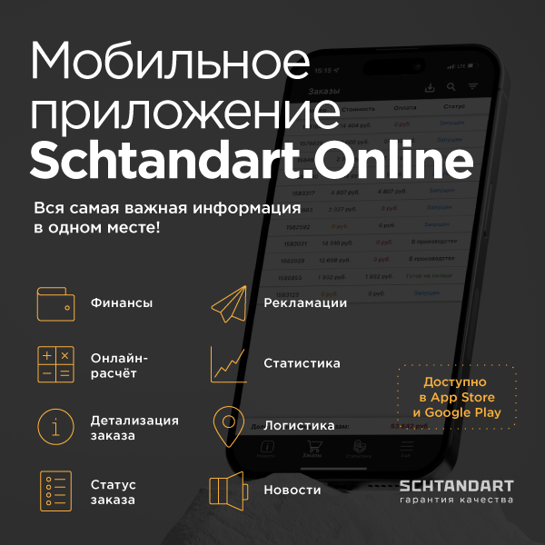 Для вас работает множество инструментов: маркетинговая поддержка, бонусная программа, гибкая система ценообразования и мобильное приложению Schtandart. Online, функционал которого непрерывно развивается. В этой статье рассказываем о возможностях приложения. На сегодняшний день доступны функции: ☑ Онлайн-расчёт заказа, с которым вы озвучите клиенту точную стоимость конструкций сразу после замера, подберёте оптимальную комплектацию и даже запустите заказ в производство одним нажатием кнопки! ☑ Отслеживание статуса заказа с момента запуска. ☑ Логистика. Видны ближайшие рейсы со списком заказов. ☑ Раздел с рекламациями для оперативного отслеживания статуса заявки. ☑ Статистика основных показателей деятельности. ☑ Новости компании, чтобы быть в курсе обновлений, новинок и акций в режиме реального времени. 8 800 2005 605
