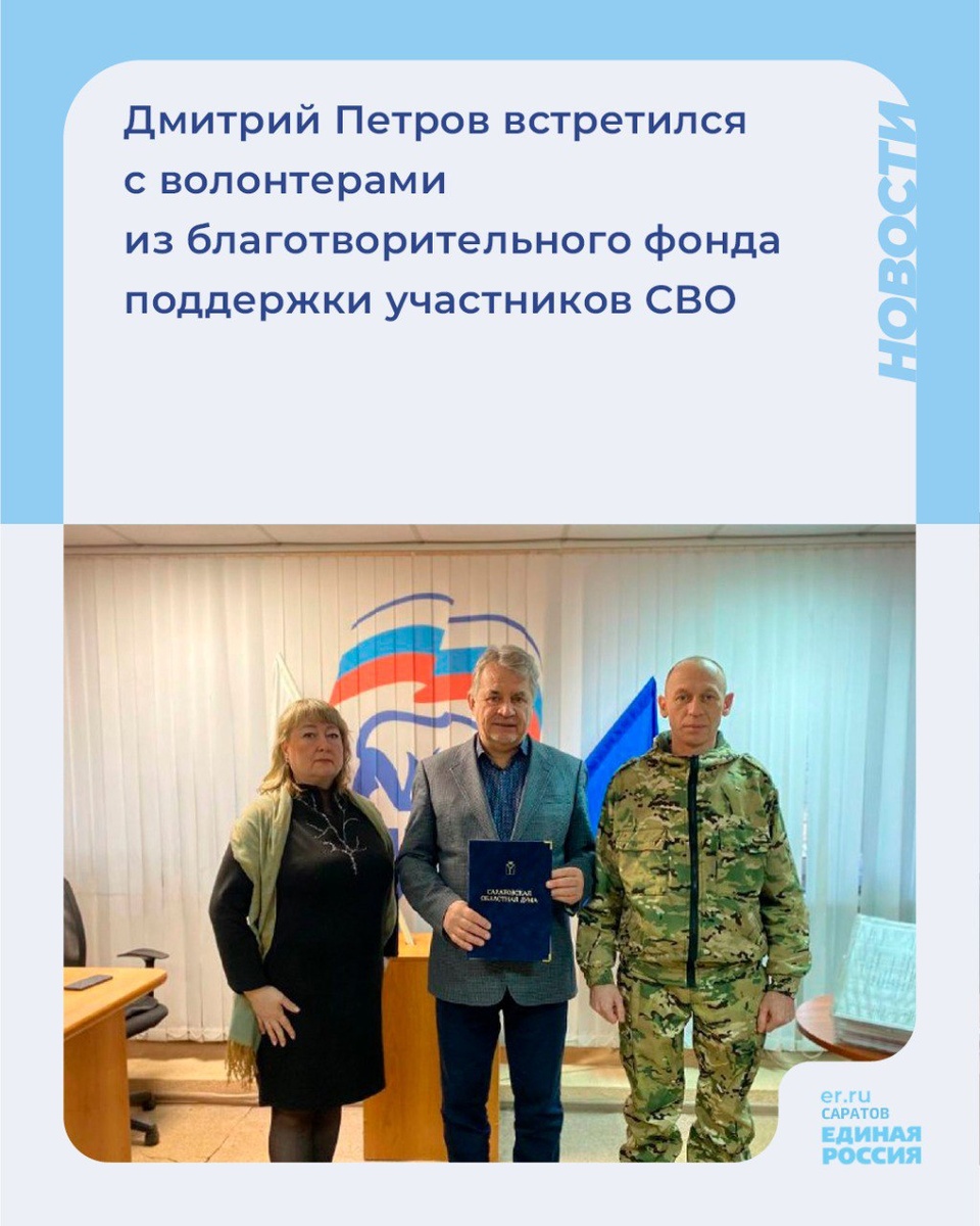 🪖Депутат вручил добровольцам из благотворительного фонда «Крепкий тыл» Почетную грамоту Саратовской областной Думы. Благотворительный фонд «Крепкий тыл» создан по инициативе общественного движения волонтёров «Z Поддержим наших» для поддержки участников специальной военной операции и их семей. 💬«Волонтеры оказывают помощь военнослужащим саратовских полков, детским домам города Луганска и Херсонской области, мирным жителям освобожденных территорий. Фонд собирает средства для закупки необходимого снаряжения, автомобилей, дронов и других ресурсов, востребованных на передовой», - рассказал Дмитрий Петров.