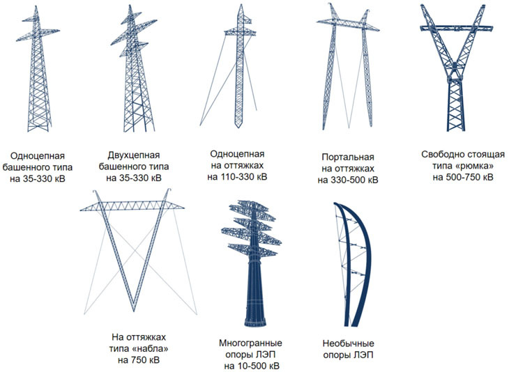 Конструктивные разновидности опор ЛЭП зависят от их назначения (выше) и основного материала. В зависимости от нагруженности и электрических характеристик ЛЭП применяются деревянные, железобетонные, сборные металлические и композитные конструкции.