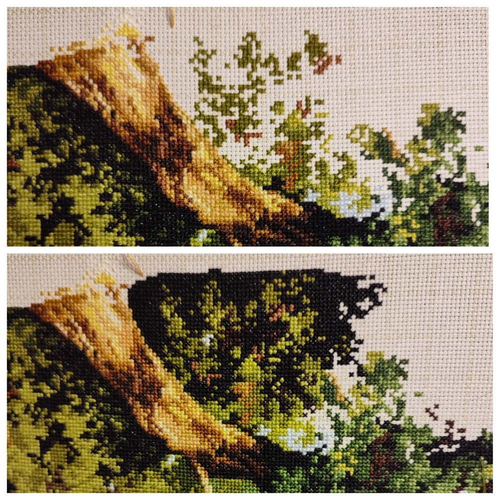 Всем привет! Промчалась неделька, и я спешу с очередным небольшим отчетом. На прошедшей неделе я успела повышивать всего два процесса, потому что в воскресенье у нас нарисовалась спонтанная прогулка в центр города, чему я очень рада, так как мы не часто выбираемся из своей деревни в город; как-то хватает ежедневных поездок туда на работу. А тут вдруг захотелось. В итоге картина нарисовалась следующая. В работе «Дубовая роща» от Лука-С вышились 1200 крестиков. Тут помогло то, что практически все вышивала одним черным цветом. Это, конечно, сильно увеличило скорость вышивания. Думала, что буду перематывать уже канву, но посмотрела, еще есть места, где можно повышивать не сильно дотягиваясь до верха. С перемоткой каждый раз у меня проблемы, потому что размер рамы не сильно отличается от размера работы. Всё впритык, из-за чего сложно закрепить боковую натяжку, а без нее совсем плохо. Мой «Наступающий кот» от Лены Элес вырос почти на 1000 крестиков. Сейчас оставила кота в покое и вышиваю ф