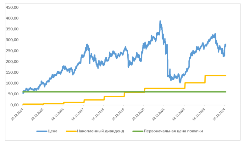 Сейчас перед российскими инвесторами стоит дилемма выбора, что лучше – положить деньги на вклад под высокий процент или инвестировать на рынке акций. Поэтому мы решили сделать ретроспективный анализ и вернуться в предыдущий цикл резкого повышения ставки (до СВО), который произошел в 2014 году. Напомним, тогда в течении 2014 года ставка была повышена с 5,5% до 17%. В середине декабря 2014 года Банк России поднял ключевую сразу на 6,5% до уровня 17%, в ответ на девальвацию рубля >50%. После этого у инвесторов появилась возможность открыть вклады со ставкой 17%+. В качестве альтернативы рассмотрим покупку акций Сбербанка. Сравним результаты за 10 лет. Инвестирование. Если бы инвестор владел акциями Сбербанка, то выплаченные дивиденды превысили сумму первоначальных инвестиций в 2,6 раза, а вернул все первоначальные инвестиции в течение первых 5,5 лет. В годовых дивиденды дали порядка 8,5%. Рост акций составил за 10 лет составил 467%, что в годовых дало примерно 16,7%. В итоге, инвестиции в