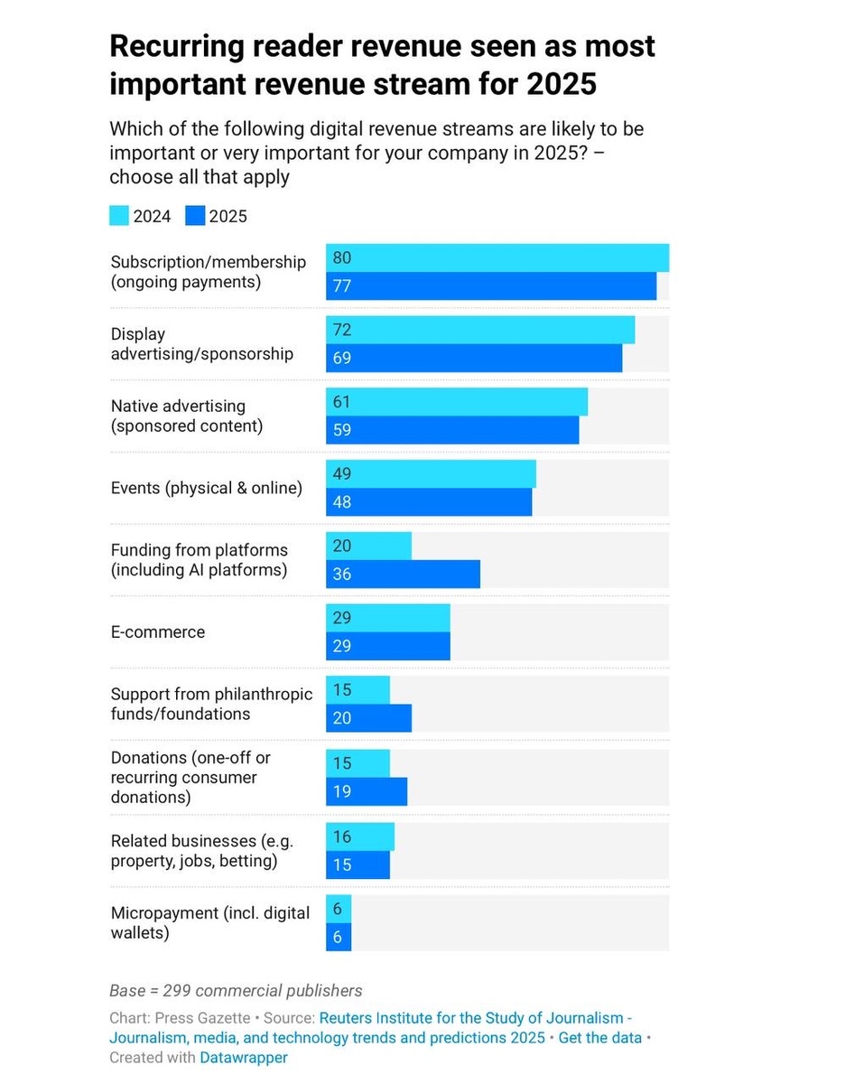55% заявили, что их внимание сосредоточено на укреплении существующего продукта, тогда как 44% заявили, что разработка новых продуктов и услуг важнее. Институт Reuters опросил 326 руководителей цифровой сферы, включая 65 главных редакторов и 63 генеральных директора или управляющих директоров, в 51 стране и территории. Ежегодный опрос тенденций и прогнозов, проводимый Институтом изучения журналистики Reuters, показал, что: ▫️41% опрошенных редакторов, генеральных директоров и других руководителей высшего звена выразили уверенность в перспективах журналистики в 2025 году, что ниже показателя в 47% в прошлом году и 60% в 2022 году. ▫️56% руководителей СМИ стали более уверенными в перспективах собственного бизнеса: с 44% в 2023 году и 48% в прошлом году Многие издатели ожидают роста трафика на фоне ожидаемого хаоса второго президентства Трампа, другие сообщают о продолжающемся росте онлайн-подписок, в то время как третьи по-прежнему считают, что быстрый рост ненадежного контента, созданно