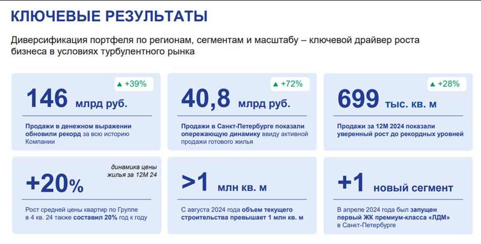 Всем привет! ETALON GROUP PLC (далее Группа «Эталон»), одна из крупнейших компаний в сфере девелопмента и строительства на российском рынке, объявляет неаудированные операционные результаты за 4 квартал и двенадцать месяцев, завершившиеся 31 декабря 2024 года, на основе управленческой отчетности Компании. «Компания показала рекордные годовые результаты по объему продаж и денежных поступлений, несмотря на рыночную турбулентность. Мы реализовали почти 700 млн кв. м стоимостью 146 млрд рублей, а поступления по договорам с клиентами превзошли аналогичный показатель крайне удачного для отрасли 2021 года. Все перечисленные показатели росли уверенными двузначными темпами. Устойчивый рост мы связываем с высоким качеством портфеля проектов и его сбалансированностью по регионам и сегментам. Дополнительную поддержку продажам оказала уверенная динамика цены, обусловленная повышением строительной готовности объектов, а в Петербурге также выходом в продажу в апреле нашего флагманского п