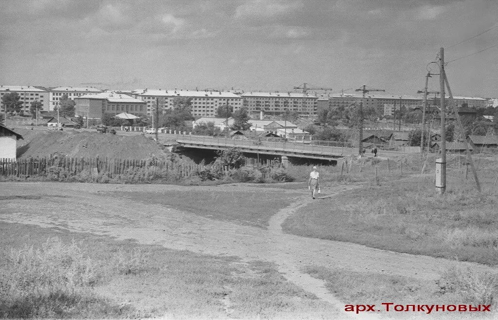 Заискитимка.1965 Вид на мост с ул. Большевистской. Автодорожный мост через реку Искитимку по проспекту Ленина.Конец 1960-х .Улица Мичурина в этом месте ещё не обустроена не говоря уже про "Антошку". Выше Искитимского моста видны промежуточная насосная станция. , ниже сегодняшнего Променада-3. На крутом берегу Искитимки ряд одинаковых домов по ул. Большевистская. "Баржа" ещё не надстроена.