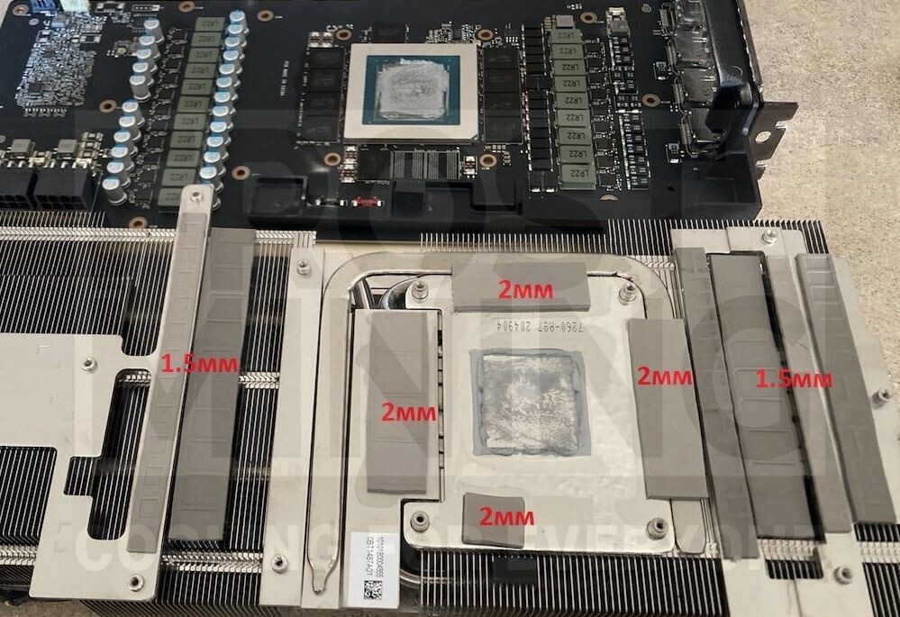 Приветствую вас друзья! Сегодня мы рассмотрим толщины термопрокладок для вендера MSI видеокарт RTX 3080 и посоветуем вам термоинтерфейсы для обслуживания! На памяти установлены термопрокладки толщиной 2 мм, на зоне питания 1.5 мм. На бэкплейте 3 мм. Система охлаждения ,действительно, выглядит внушающим. Для данной модели советуем использовать термопрокладки FrostMining Maximum Thermal Pads 20Вт/мК и термопасту OTK-1 на 13 Вт/мК. На памяти установлены термопрокладки 1мм, на зоне питания 3мм, 2мм,1.5мм. 1 мм. На бэекплейте 3 мм. FrostMining Maximum Thermal Pads 20Вт/мК отлично подойдут для обслуживания. При очистке видеокарты от старых термопрокладок используйте ненужную зубную щетку, так как заводские термопрокладки лежат даже не на специальных площадках, а просто на рёбрах. Вытащить остатки термопрокладок с накипевшего радиатора поможет Изопропиловый спирт, щеточка и компрессор. На память установлены термопрокладки толщиной 2.25 мм, на зоне VRM 2.5 мм и 1.25 мм. На память можете