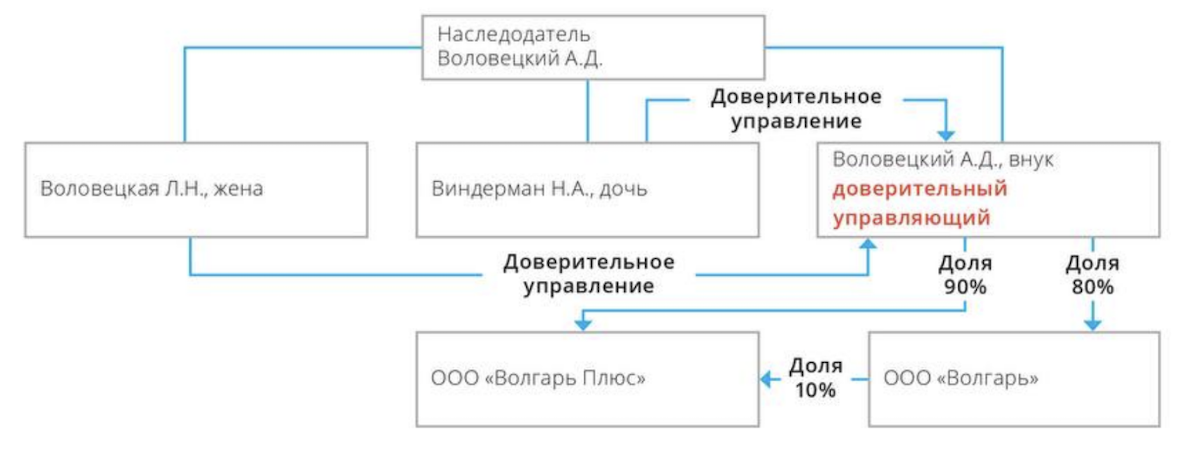 Переданные 90% долей в ООО «Волгарь Плюс» по договору доверительного управления содержа-ли в себе 45% долей, которые Л.Н. Воловецкая получила не как наследница, а как супружескую долю.