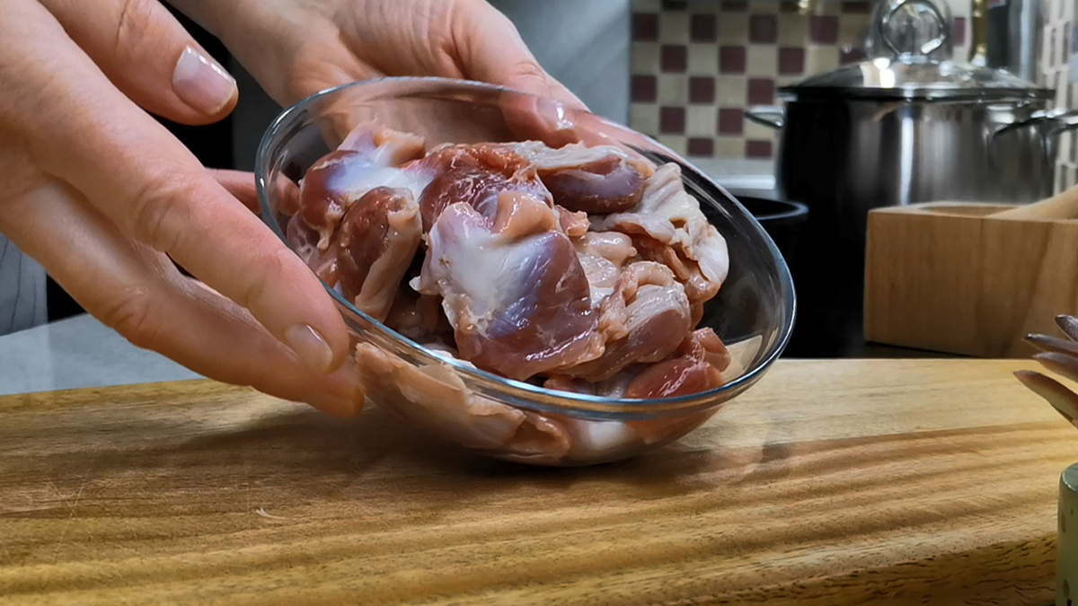 Итак, берем куриные желудочки, хорошенько их моем и чистим от того, что на них осталось - мелкие жилки, пленочки, кусочки жира. Режем на кусочки, не слишком мелко, но и не так крупно. В общем, чтобы удобно было потом есть.
