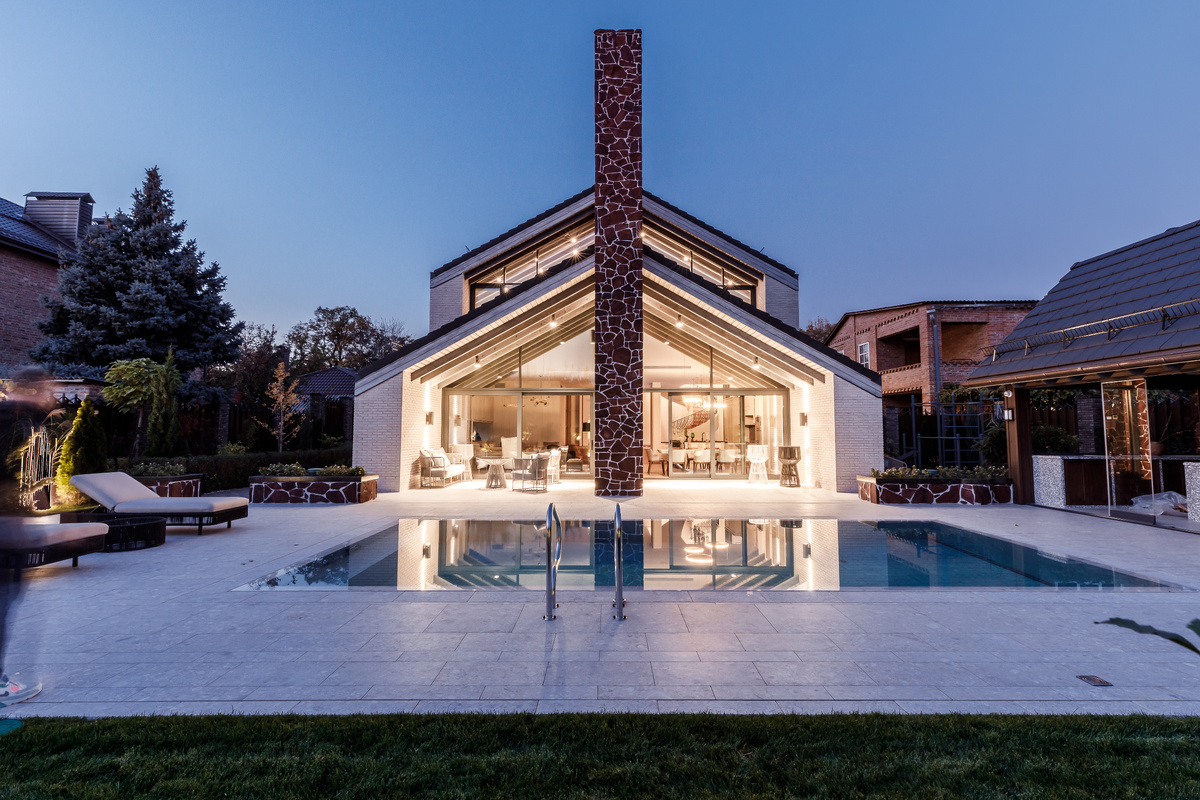 Найти похожие среди всех проектов студии Chado невозможно, каждый из них — авторский. Двухэтажный дом, работа над которым шла несколько лет, не исключение. Его приземистые объемы из железобетона облицованы кирпичом и камнем, симметрию строения подчеркивает труба двустороннего камина, проходящая по центру фасада, треугольнику фронтона вторит линия навеса террасы, и экстерьер приобретает интересную уступчатую форму. В интерьере отчетливо просматривается структура здания, которую авторы проекта не стали маскировать декором, а вывели на первый план. В оформлении внутреннего пространства активно использованы материалы фасада: бетон, камень, декоративная штукатурка. Уютную атмосферу в открытых помещениях создают теплый оттенок шпона на фасадах мебели и потолочные балки. Этот проект авторы делали под ключ, в том числе работали и над ландшафтным дизайном. Площадь участка невелика, а большое количество зелени, деревья, высаженные по периметру двора, придали ему камерность. Рядом с бассейном раз