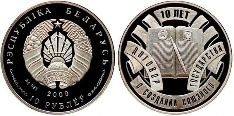 Намерения интегрировать Россию и Белоруссию муссировались с самого распада СССР, и в 1999 году стороны подписали договор о поэтапном объединении. Хотя вопрос в итоге повис в воздухе, к десятилетнему юбилею утверждения союзного государства выпустили партию юбилейных серебряных рублей, заказанных на Литовском монетном дворе. Республика Беларусь пока не имеет собственного монетного двора. Долгое время государство обходилось без обиходных монет, поэтому в тот период для минских властей было выгоднее заплатить за чеканку коллекционных монет другой стране, чем затевать собственное производство. Оборотная сторона демонстрирует условный текст соглашения между РФ и Белоруссией с их государственными символами на левой и правой странице. Рядом лежит перьевая ручка, а вокруг содержится название договора и срок, прошедший с момента подписания.