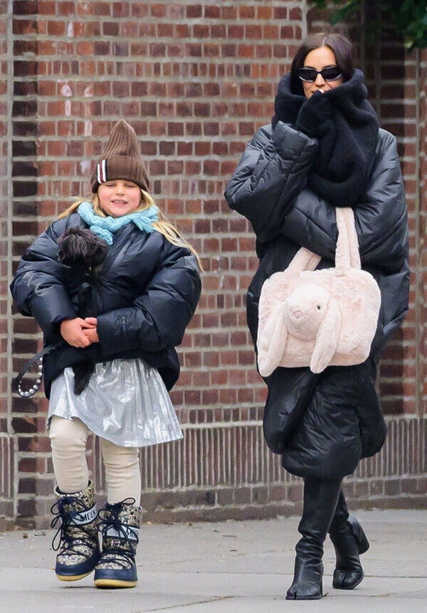 39-летняя супермодель умеет превращать обычную прогулку по городу в модное дефиле. Папарацци запечатлели ее на улицах Нью-Йорка с дочерью, 7-летней Лией, и йоркширским терьером по кличке Арахис. Ирина себе не изменяет: черный тотал лук — любимая и всегда уместная комбинация, в которой ее привыкли видеть поклонники. Центральный элемент образа — пуховик бренда Norma Kamali, который в Сети прозвали спальным мешком. Его стоимость — 475 долларов (чуть больше 48 тысяч рублей). На ногах — узнаваемые «копытца» от Maison Margiela за 1 790 долларов (около 182 тысяч рублей). Завершили аутфит футуристичные темные очки и огромный шарф. Не могу не отметить, что в этом же пуховике Шейк видели и прошлой зимой — что ж, отрадно, когда инфлюенсеры поддерживают тренд на осознанное потребление. Лия, похоже, снова одевалась сама: цветные мунбуты, стальная юбка, бирюзовый шарф, черная курта с капюшоном и коричневая шапка. Вместо аксессуаров — все тот же очаровательный Арахис. Пуховик, похожий на Иринин, но в