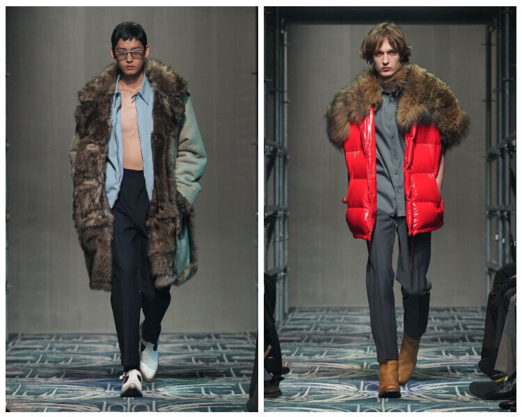 В Милане стартовала Неделя моды. Футуристическим дизайном подиума впечатлил показ Prada: двухуровневая сцена с подсветкой, металлические конструкции и бетонные блоки вместо стульев стали неожиданным элементом шоу. Но нас интересуют тренды! В этот раз Миучча Прада и Раф Симонс сделали акцент на приталенные и обтягивающие силуэты. Мех, который не раз появлялся на предыдущих коллекциях, снова вернулся на пальто, куртки, бомберы, капюшоны и жилеты, при этом он выглядит небрежно и расслабленно. Особое место в мужской моде заняли клетчатые пальто и скинни брюки, которые вновь обрели популярность. Для любителей рискованных решений в коллекции есть кожаные костюмы (такой, например, был на Никите Гнетневе) и атласные смокинги, а также пижамные полосатые брюки в сочетании с гранжевыми свитерами и выразительными ботинками. Также продолжает развиваться тема многослойности: дизайнеры комбинируют два пуховика или пиджаки и плащи, под которыми явно видна кожа. Важное внимание уделили ярким акцентам и