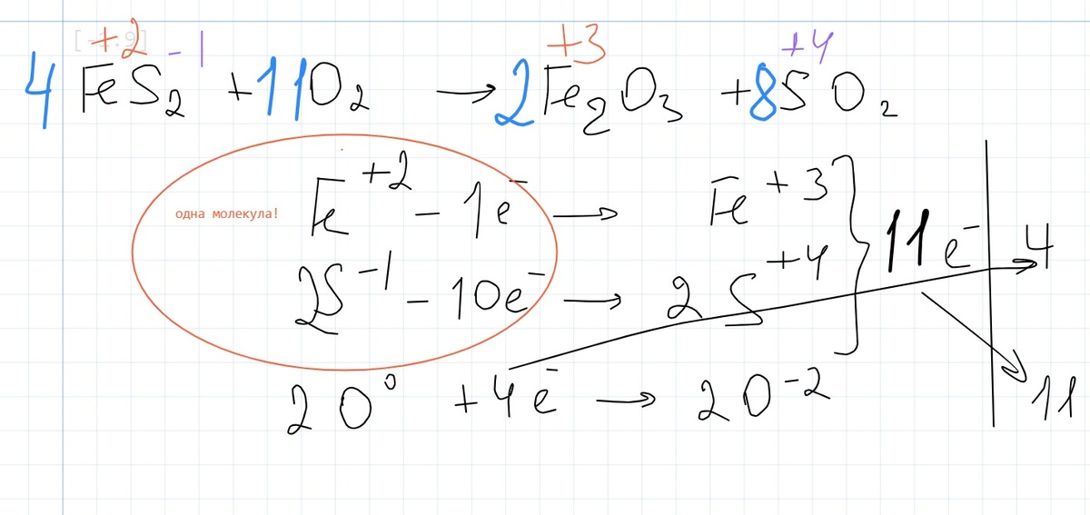 Иногда встречаются окислительно-восстановительные ситуации, когда окислению подлежат атомы сразу двух элементов и оба они находятся в одной молекуле. Как составить корректный электронный баланс? Самый известный пример - обжиг пирита, который описывается схемой: FeS2 + O2 → Fe2O3 + SO2 Коэффициенты можно, конечно, вызубрить. А можно понять, как это делается. Когда вы составляется электронный баланс, сделайте так, чтобы понять, сколько электронов отдаёт суммарно одна молекула восстановителя: Другой пример - взаимодействие сульфида мышьяка с азотной кислотой: As2S3 + HNO3 → H3AsO4 + SO2 + NO2 + H2O Формируем электронный баланс, исходя из состава одной молекулы, а потом только докручиваем недостающие коэффициенты: А вот немного более сложный случай. Иодид меди (I) окисляется концентрированной серной кислотой. В одной молекуле иодида меди - два восстановителя. И здесь нужно сразу же, на этапе формирования электронного баланса учесть индекс у иода в продукте. Тогда получается: Надеюсь,