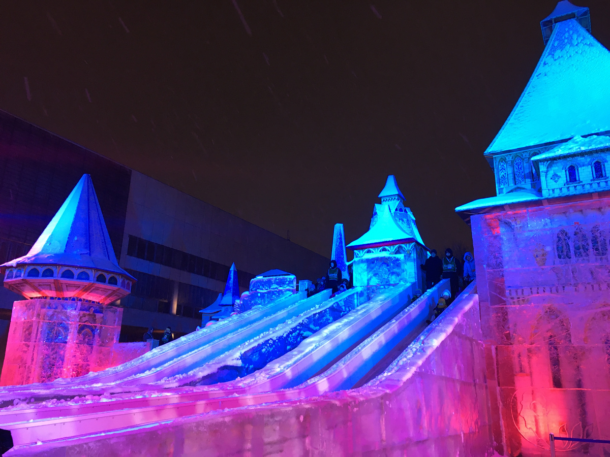 Весь "Ледяной замок чудес" с ледяными башнями и ледяными горками по вечерам подсвечивался разноцветными огоньками, которые создавали праздничное настроение и настоящую атмосферу волшебства. Светодиоды, вмонтированные в ледяные башни и горки, подчёркивали красоту прозрачного льда, сверкающего от подсветки как хрусталь. Специально для фестиваля в столицу доставили 600 тонн льда, а идеальный для скульптур по толщине и прозрачности материал нашли на озёрах в Челябинской области.