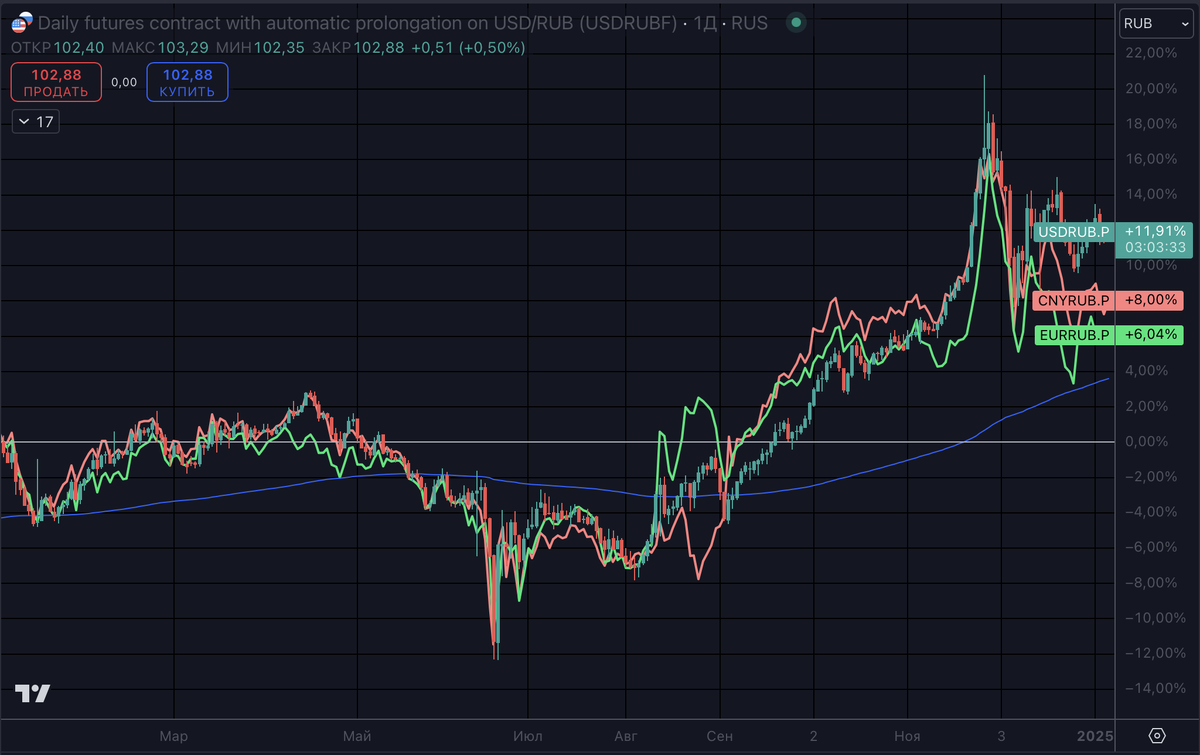Всем привет, на связи Эван! Недавно я давал комментарий на радио Коммерсантъ FM (https://www.kommersant.ru/doc/7421167), где как раз обсуждали валюты. Однако считаю важным тут пояснить подробно всю ситуацию с популярными валютами и свое видение на год. Первым делом подведем итоги 2024 года. На этом графике вы можете увидеть, как три наиболее популярных валюты (юань, доллар, евро) проявили себя с 31 декабря 2023 года по сегодняшний день к рублю: Доллар в лидерах — +11,91%. Юань на втором месте с +8%. Евро замыкает с +6,04%. Как можно заметить, евро стало абсолютным аутсайдером, проиграв даже простейшим вкладам и накопительным счетам. И именно эту валюту я считаю на 2025 год непривлекательной. Почему? 1. Экономика еврозоны выглядит слабо. Постепенно разгорается политический кризис. Трамп подливает масла в огонь, так еще и непонятно, кто будет финансировать конфликт. 2. Трамп уже озвучивал, что будет вводить торговые пошлины против европейских товаров. Это будет снижать европейский эксп